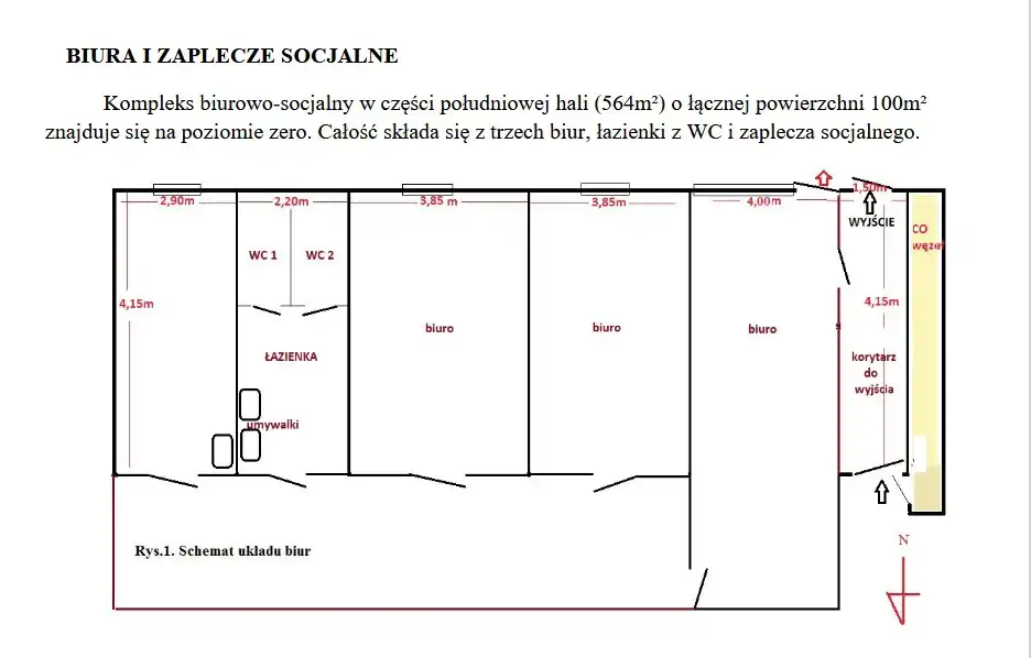 Do wynajęcia hala magazynowa wraz z kompleksem biurowo-socjalnym o łącznej powierzchni 564m². Kompleks biurowo-socjalny o łącznej powierzchni 100m², składa się z trzech biur, łazienki z WC i zaplecza socjalnego. OD 1 STYCZNIA 2026 ROKU!!!!