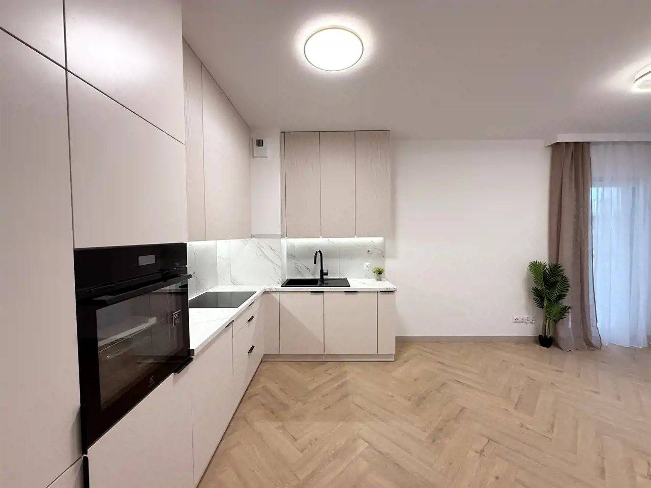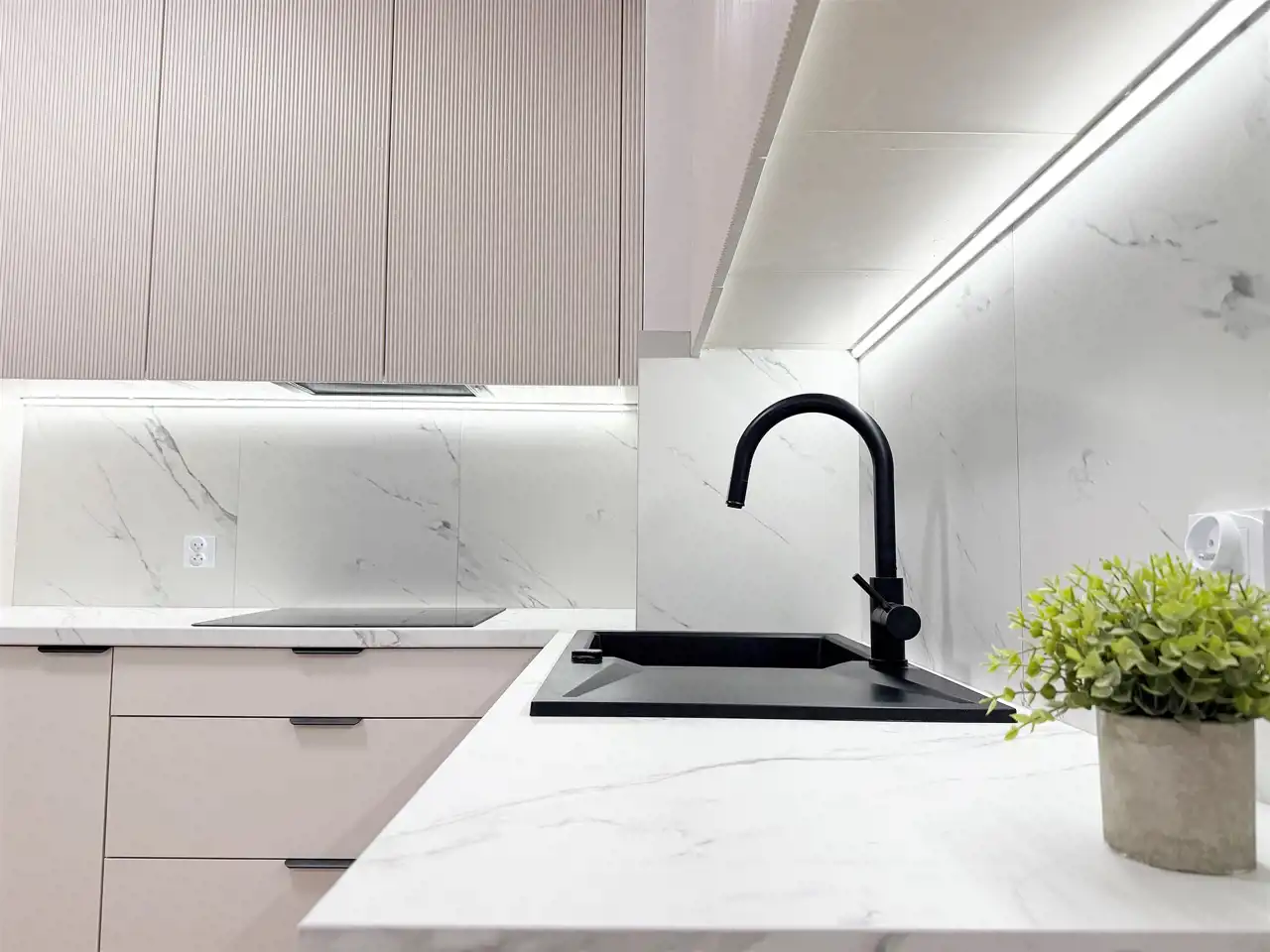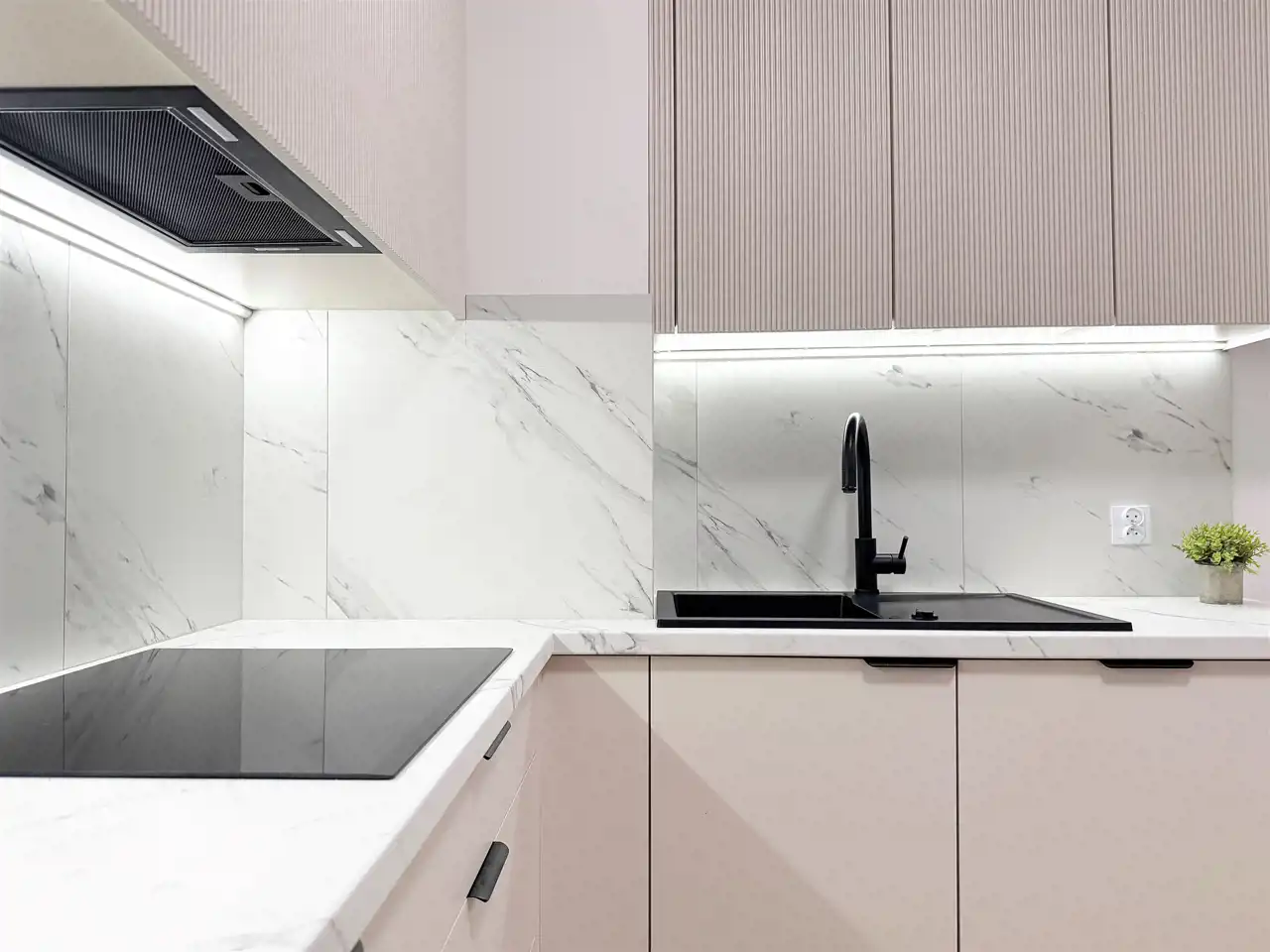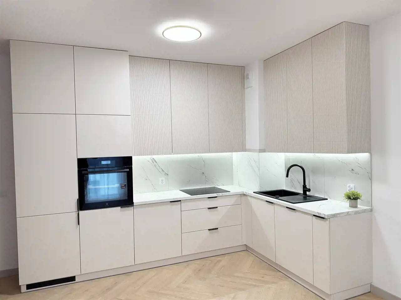 – nowoczesna kuchnia na wymiar z systemem Blum, w odcieniu szampańskiego Kaszmiru, z ryflowanymi frontami i blatem imitującym marmur