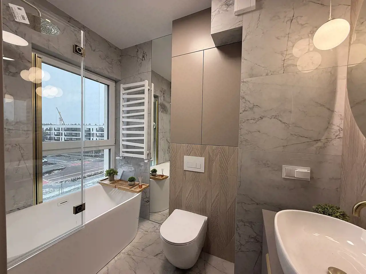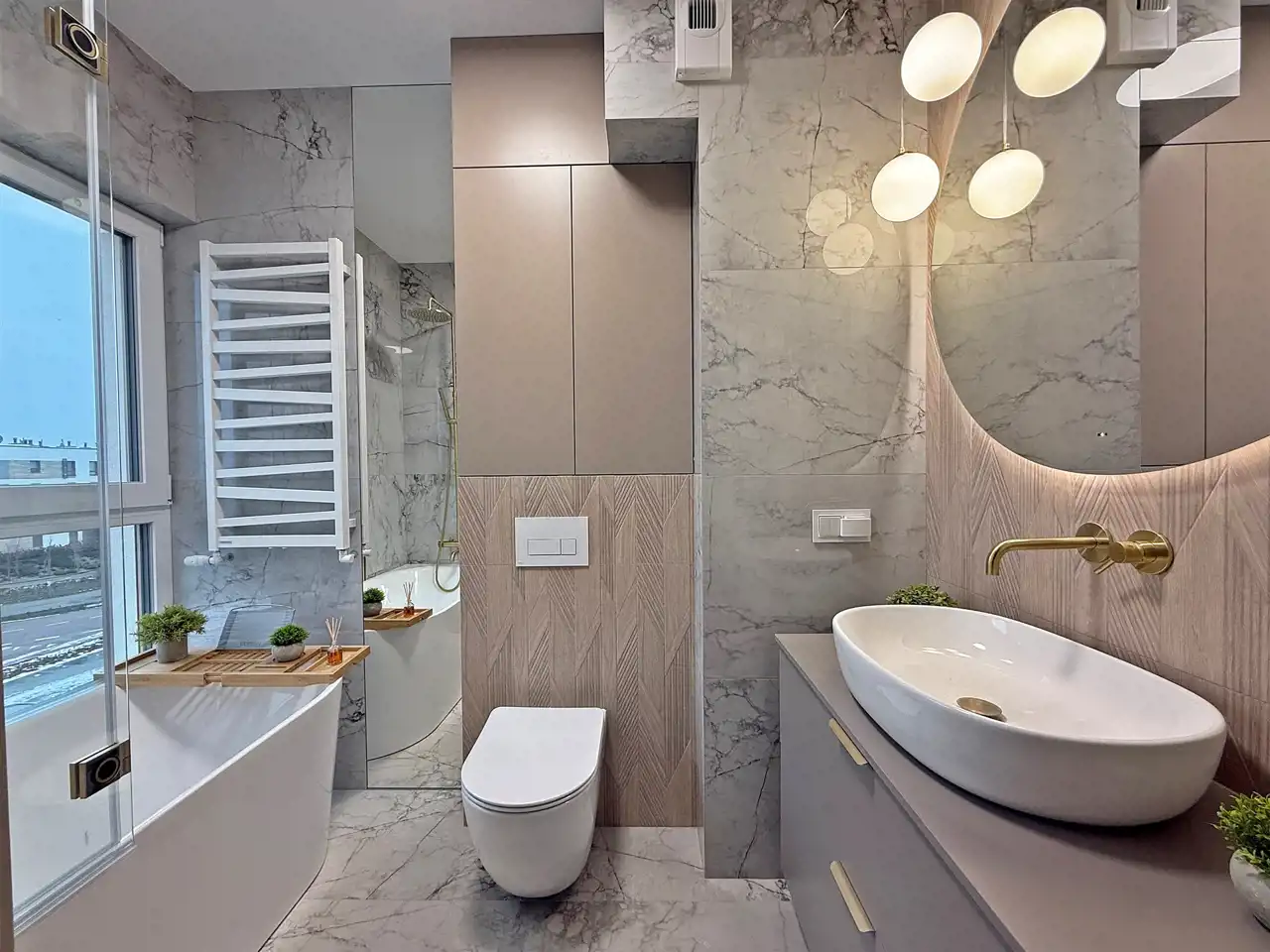 – łazienka projektowana i kompletowana w firmie Bokaro, z armaturą Omnires (szczotkowane złoto), glazurą Tubądzin i Azuvi listelli Corda