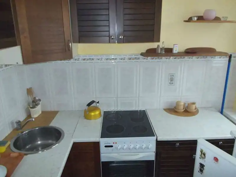 Kuchnia umeblowana, z oknem, wyposażona w kuchenkę elektryczną, lodówkę.