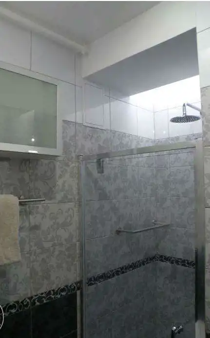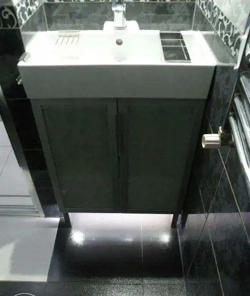 W łazience utrzymanej w czarno-białej tonacji znajdują się nowoczesne, lecz stonowane meble i armatura z wyższej półki. Zamiast kabiny prysznicowej, zastosowano tutaj droższą, lecz o wiele praktyczniejszą w utrzymaniu deszczownię z odpływem liniowym oraz solidnymi drzwiami ze szkła hartowanego. Wszystkie wnęki ponad głowami oraz na dole zostały gustownie podświetlone, co daje niepowtarzalny efekt.