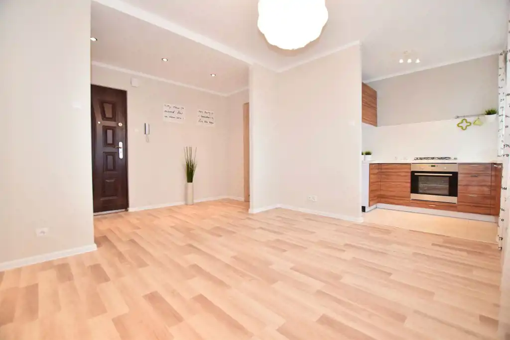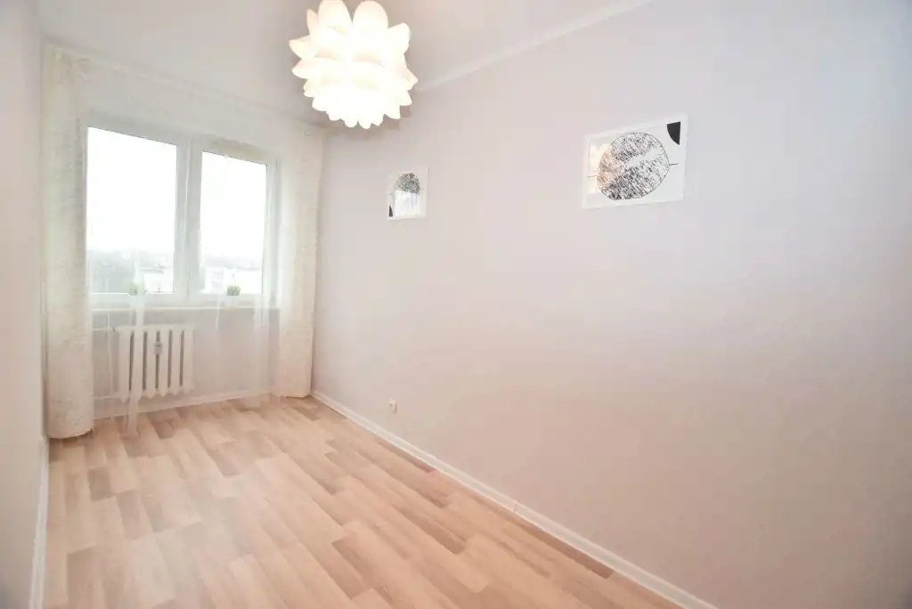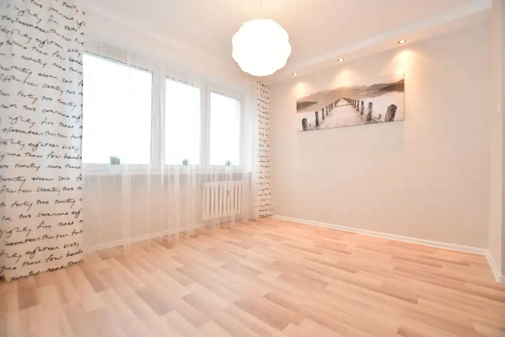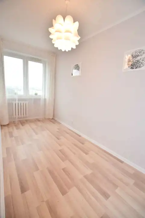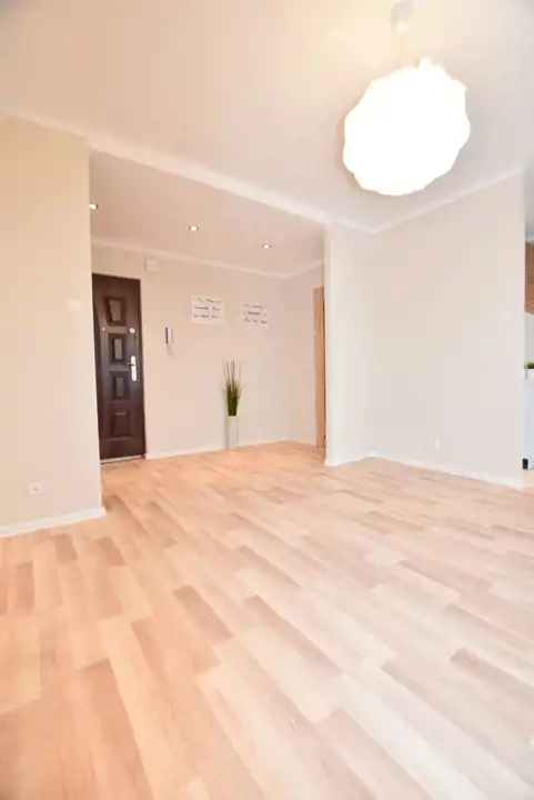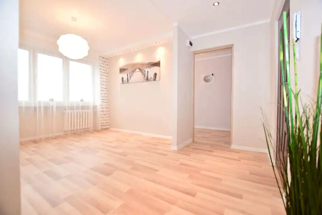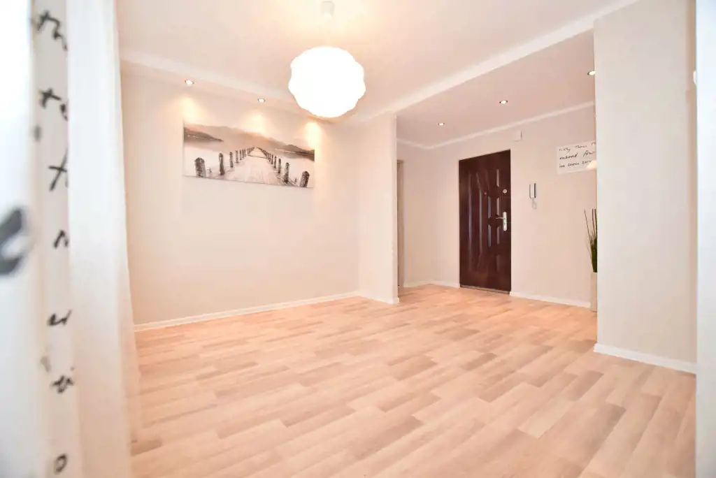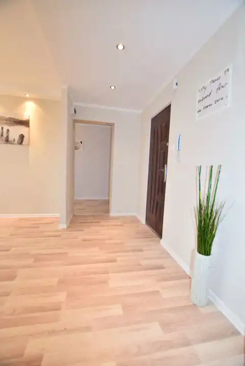 W całym mieszkaniu położono gładzie, wymieniono drzwi wejściowe oraz wewnętrzne wraz z ościeżnicami na nowe. Położono gustowne panele z białymi listwami.