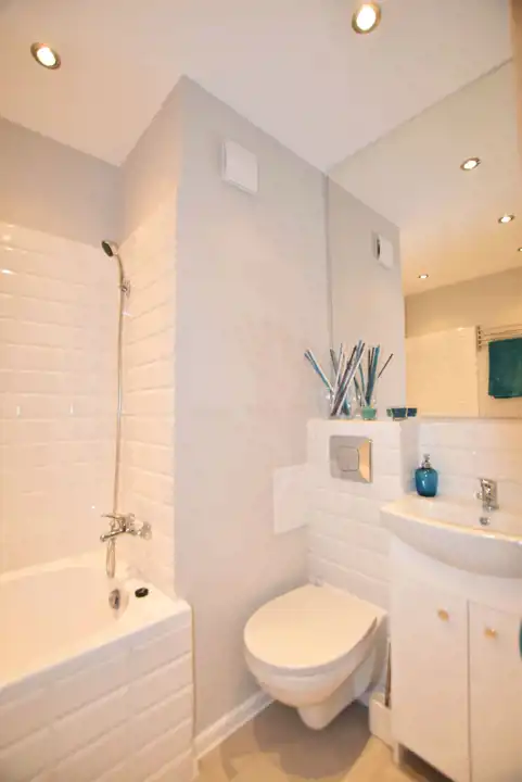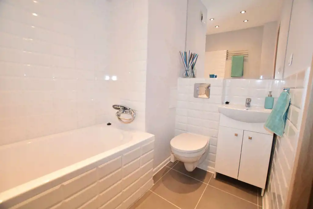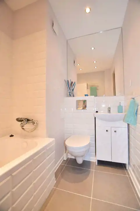 Łazienka również bardzo nowocześnie zaaranżowana ( połączenie gładzi w kolorze popielatym z białymi płyteczkami). Wymieniono instalację wodno - kanalizacyjną. Zamontowano nową wannę, podwieszany sedes z deską wolno - opadającą oraz szafkę z umywalką oraz duże lustro.