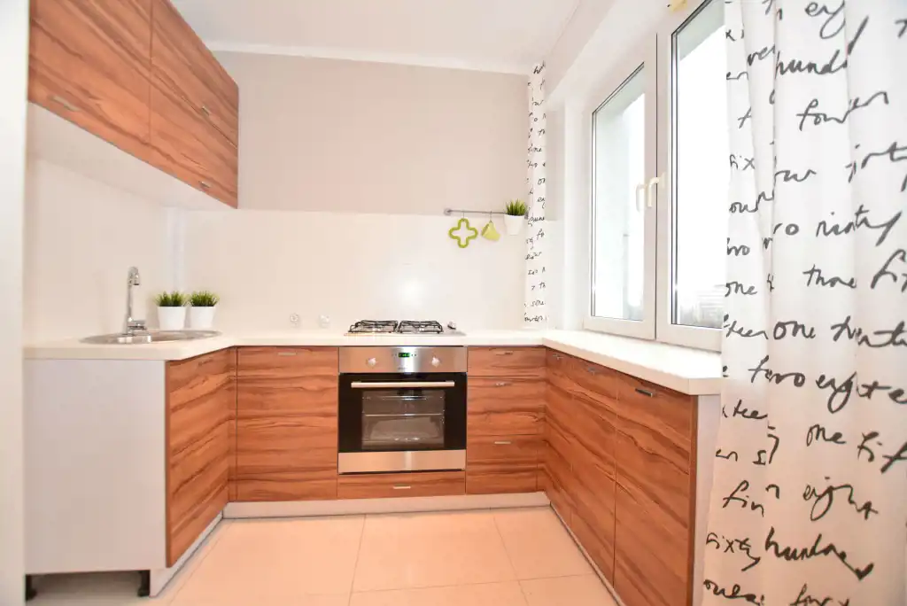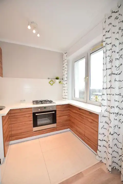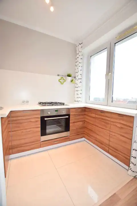 Kuchnia również po kapitalnym remoncie z nową zabudową kuchenną zrobioną na wymiar. Sprzęt AGD ( płyta i piekarnik ) oraz zlew z baterią również nowe - wszystko pozostaje w cenie mieszkania. Na podłodze w kuchni położono duże płytki gresowe białe 60x60 cm , a fartuch wykonano z nowoczesnych białych dużych płytek. Nowa instalacja gazowa.