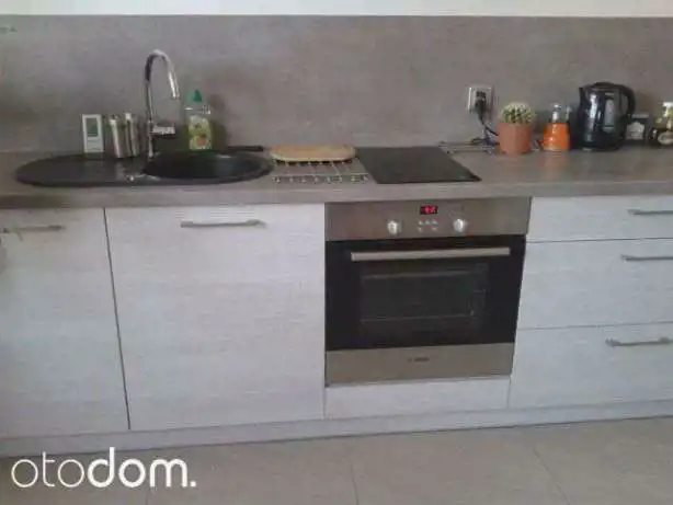 Pokój z aneksem kuchennym około 28 m przy czym zabudowa kuchenna w jasnych, neutralnych barwach pasująca niemal do każdego wnętrza i wystroju w cenie mieszkania.