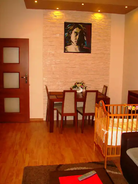 Mieszkanie o podwyższonym standardzie wykończenia- w pokojach położono panele, na ścianach gładzie i kamień sztuczny.