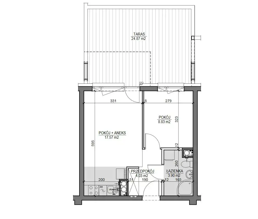Posiada powierzchnię 35,55 m2 na którą składają się: salon z aneksem kuchennym, sypialnia, łazienka z WC oraz przedpokój.