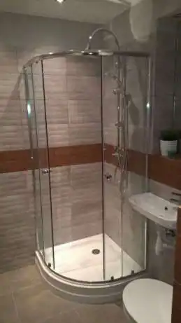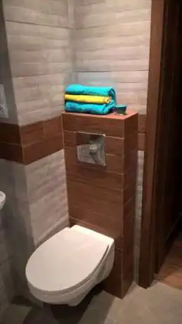 W łazience zainstalowano kabinę prysznicową oraz stelaż podtynkowy wc.