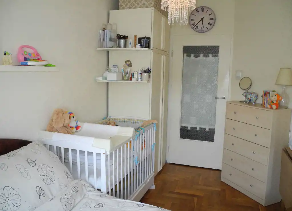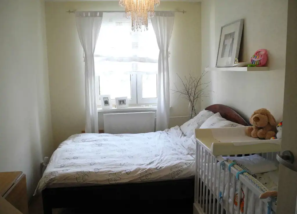 W większym pokoju zabudowana jedna ze ścian- szafa o szer. 2,7 m.