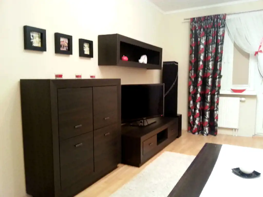 Mieszkanie jest w pełni umeblowane i wyposażone (2 zabudowy typu KOMANDOR, meble wolnostojące - łóżko sypialniane, narożnik wypoczynkowy rozkładany, trzy komody, ława, szafka TV, półki wiszące, itp.