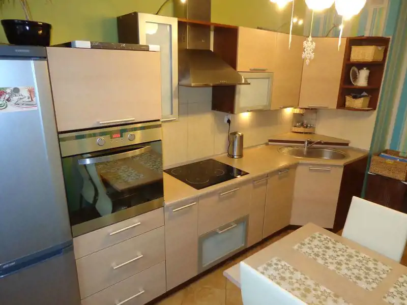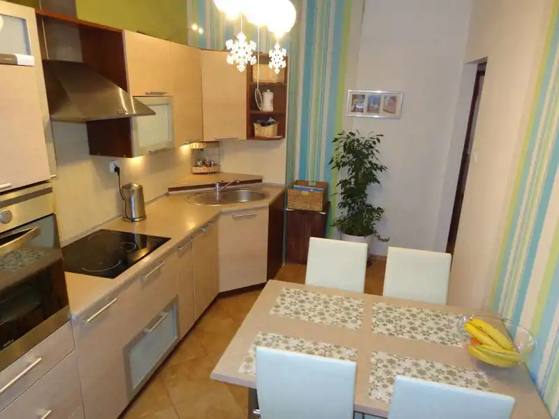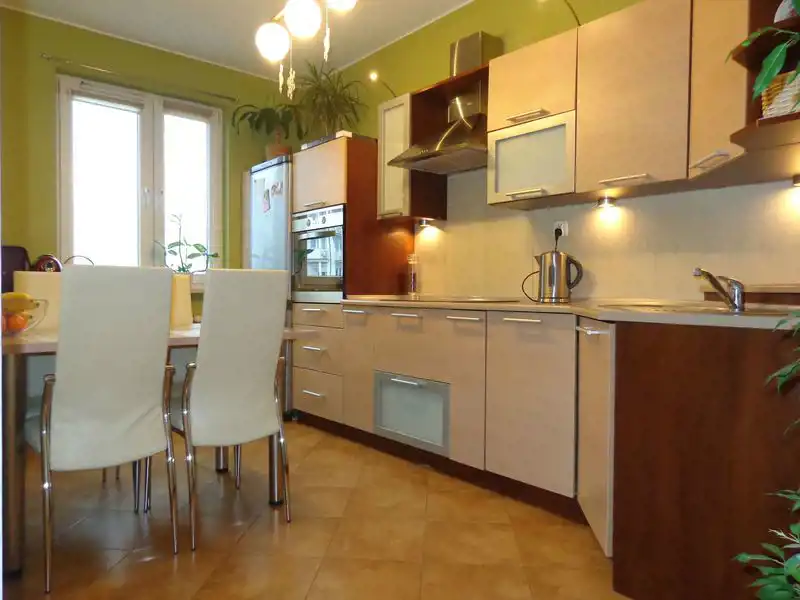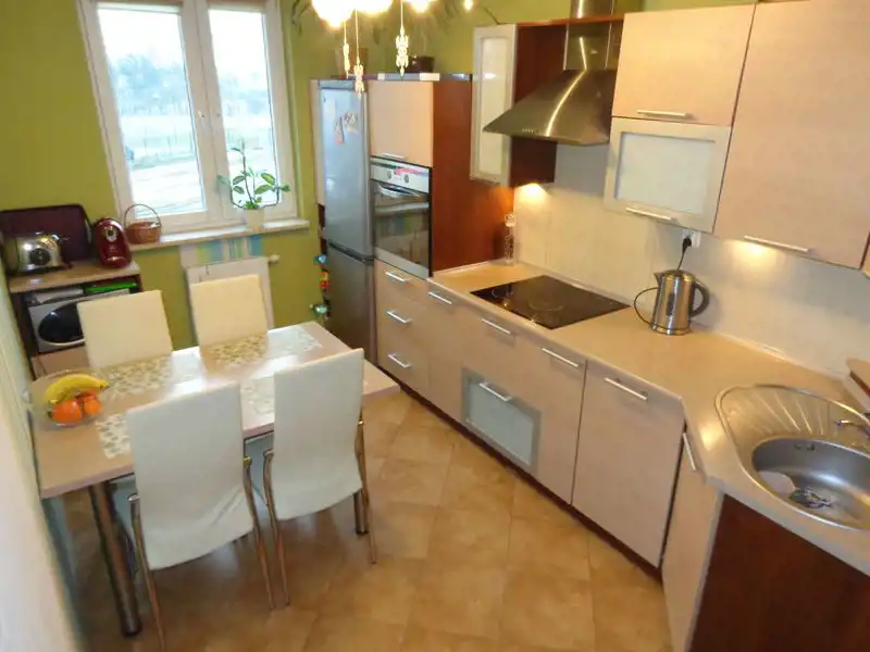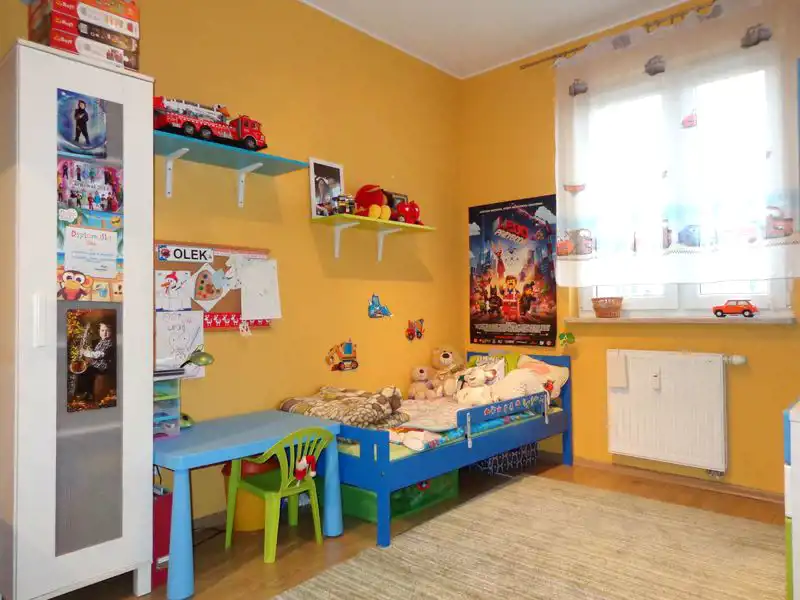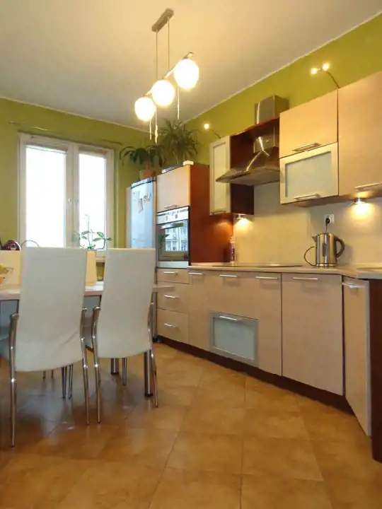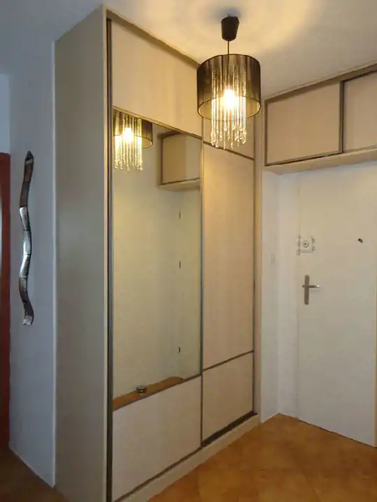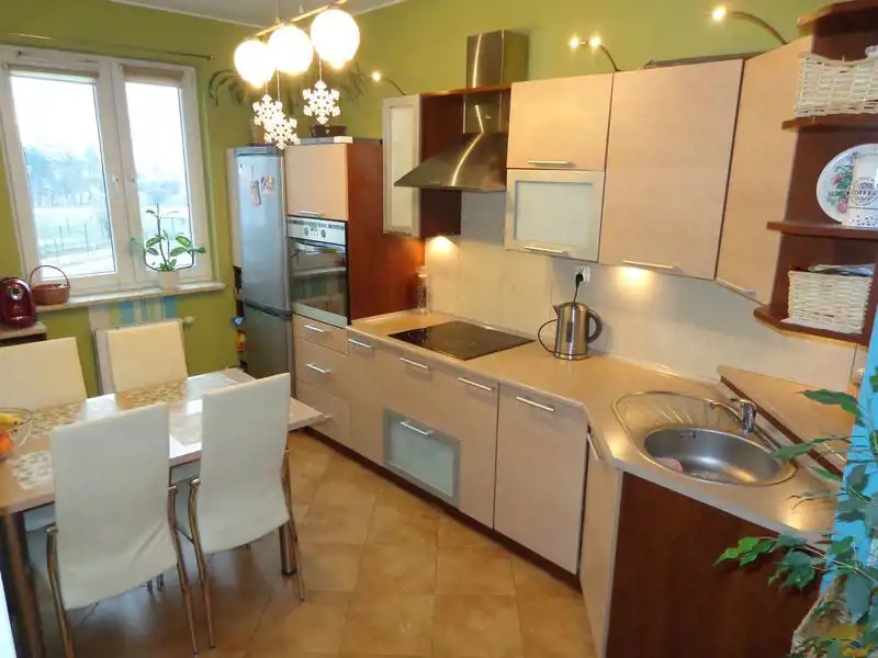 Wchodząc do mieszkania znajdujemy się w szerokim przedpokoju zabudowanym szafą Komandor. Na podłodze położona jest terakota która ułatwia utrzymanie czystości. Po lewej stronie napotykamy sypialnię, równie przydatną jako pokój dziecięcy. Idąc w głąb, następne pomieszczenie po lewej stronie to przestronna kuchnia która mieści dużo szafek oraz stół z krzesłami. Bogato wyposażona w sprzęt AGD: zmywarkę, piekarnik, płytę elektryczną, ucieszy każdego kto uwielbia gotować. Pomieści także Twoją rodzinę spożywającą posiłki.