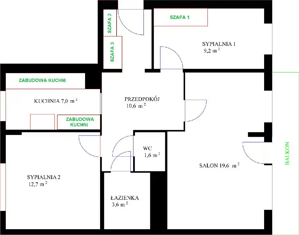 - dwie sypialnie 12,7 i 9,2 m2,