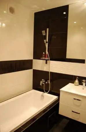 W łazience nowoczesna glazura na ścianach, wanna z możliwością prysznica.