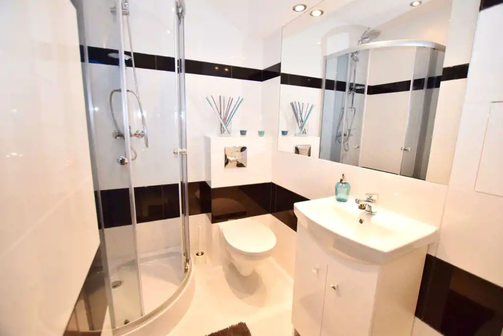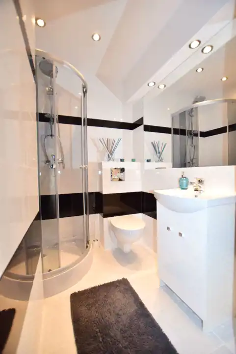 Łazienka nowocześnie zaprojektowana wyposażona w kabinę prysznicową, umywalkę z szafką i podwieszany sedes.