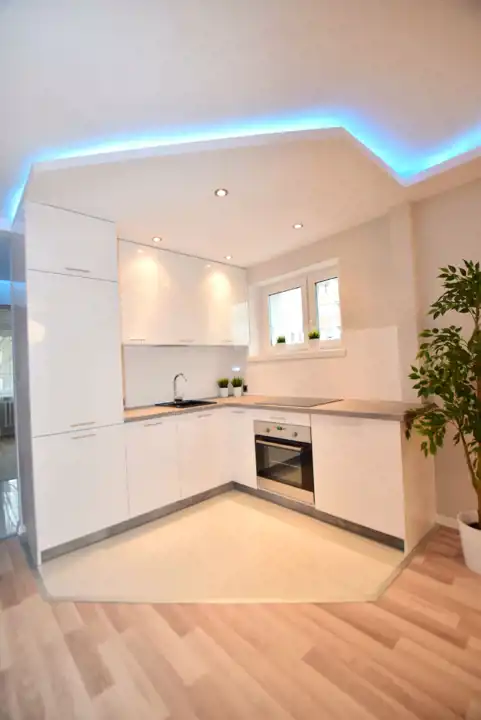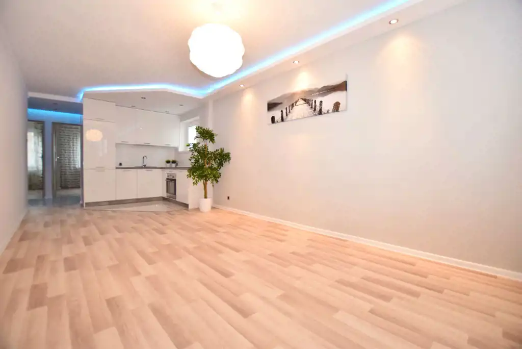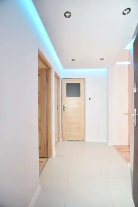 W pokojach na ścianach gładzie podwieszane sufity z oświetleniem ledowym na pilota, na podłodze w przedpokoju i kuchni biały gres polerowany w pokojach wysokiej klasy panele podłogowe.