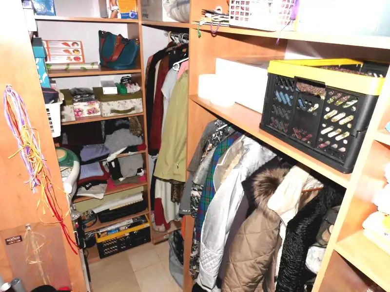 W garderobie znajdują się regały.