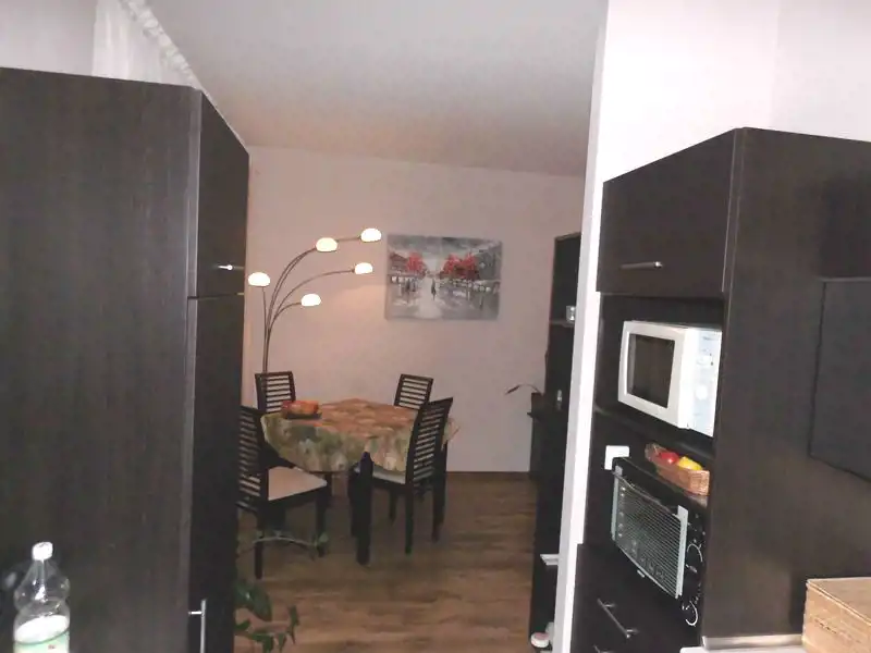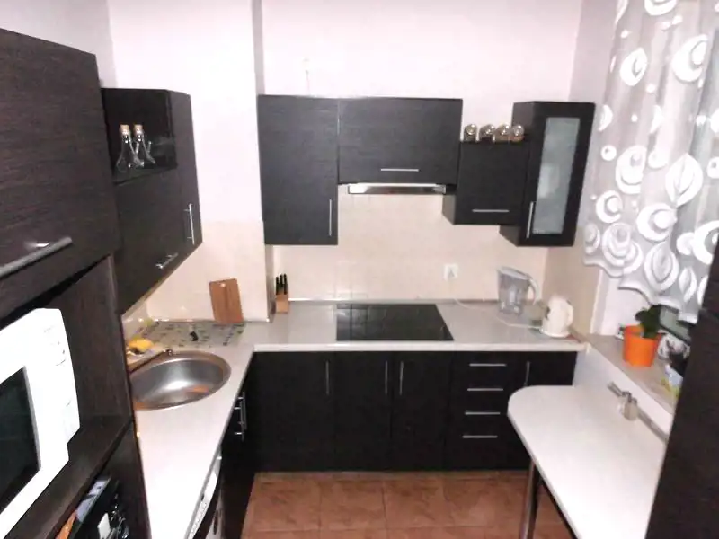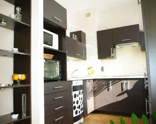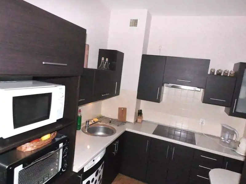 W kuchni jest zabudowa kuchenna,sprzęt AGD: płyta ceramiczna, zmywarka, piekarnik, lodówka, mikrofalówka.