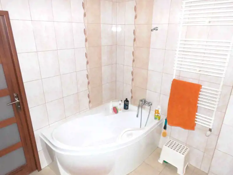 Łazienka wyposażona jest w dużą narożną wannę.