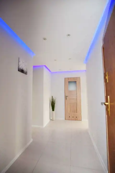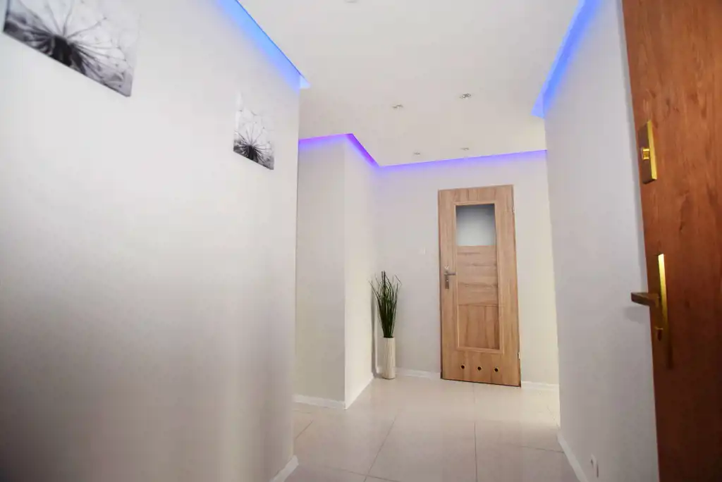 W przedpokoju wykonano podwieszany sufit z oświetleniem halogenowym.