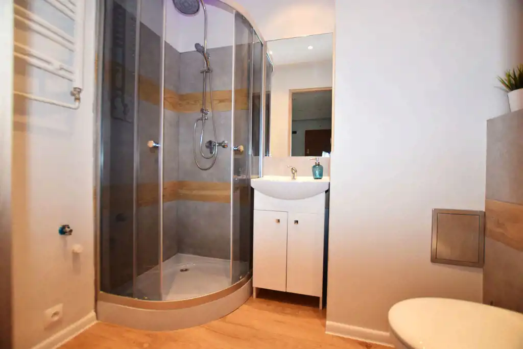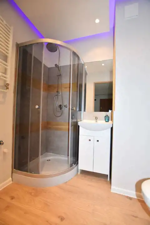 Mieści się tam kabina prysznicowa, umywalka, szafka.