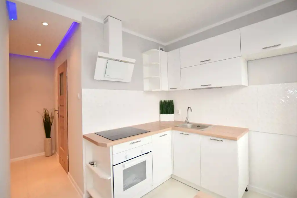 Kuchnia została wyposażona w nowoczesną zabudowę wraz ze sprzętem AGD: (piekarnik, płyta grzewcza, okap).