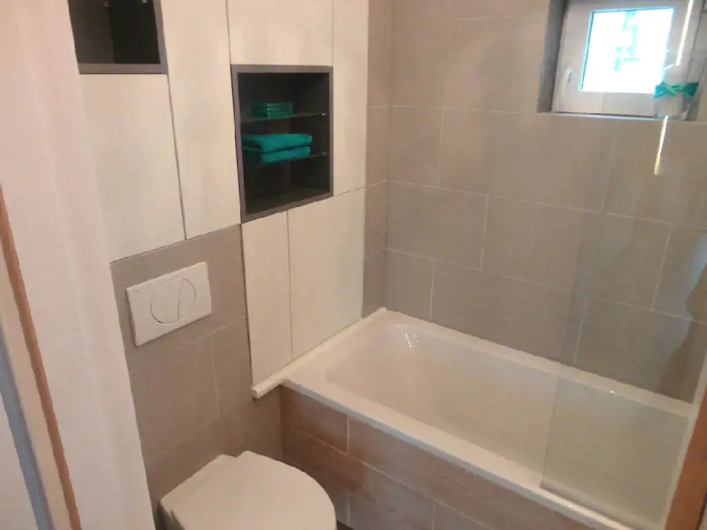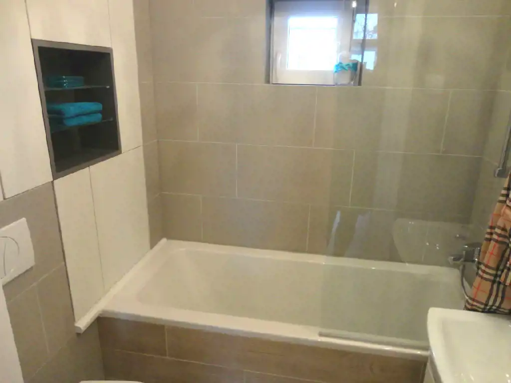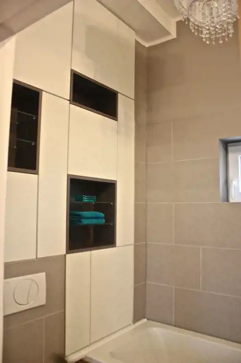 W łazience wanna, system podtynkowy zabudowa na wymiar szafek otwieranych w systemie TIP-ON, okno. W sypialni ogromna szafa z drzwiami przesuwnymi.