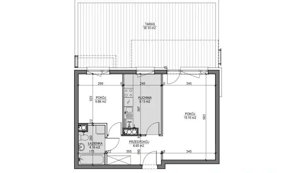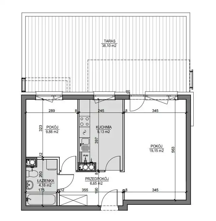 Z salonu prowadzi wyjście na DUŻY TARAS: 38,10 m2.