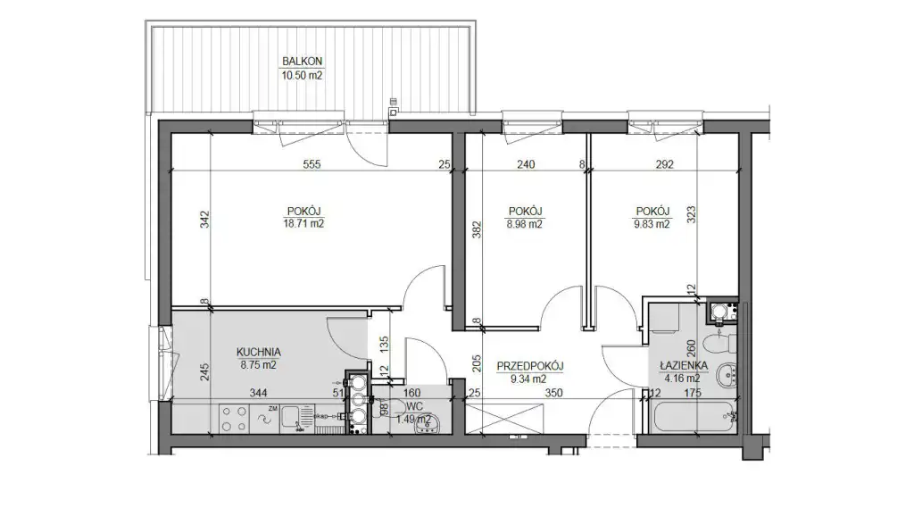 Z salonu prowadzi wyjście na duży balkon o pow. 9,14 m2.