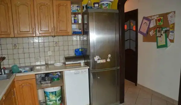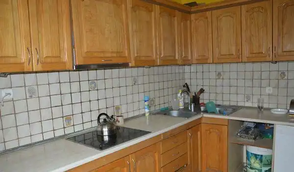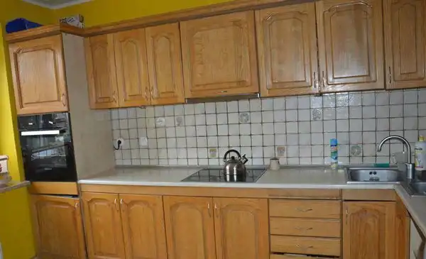 W pokojach na podłodze panele, na ścianach gładzie. W kuchni drewniana zabudowa wraz ze sprzętem AGD oraz dużym rozkładanym drewnianym stołem i 6 krzesłami. W łazience duża narożna wanna.