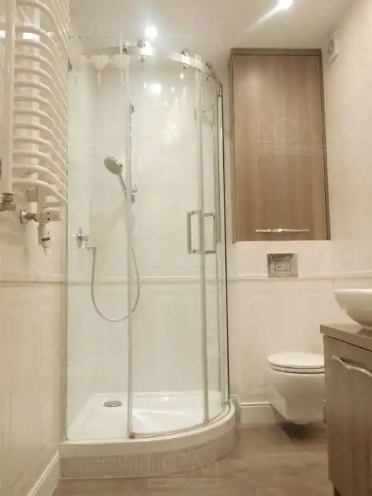 -łazienki z prysznicem (90cm x 90cm), wraz z zabudową nad toaletą, szafką z umywalka oraz szafką wiszącą