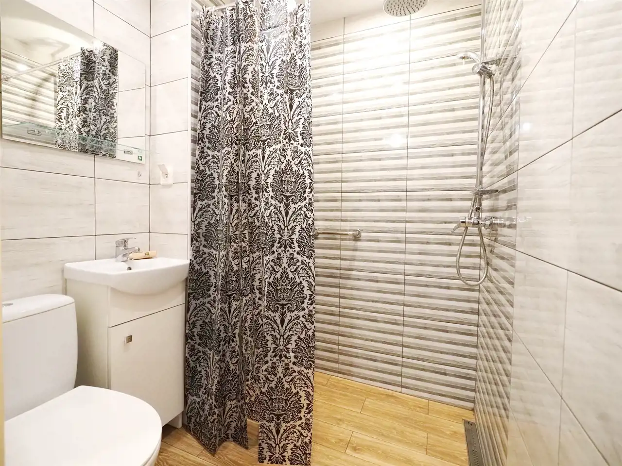 W łazience prysznic, toaleta. Na ścianach tapety.