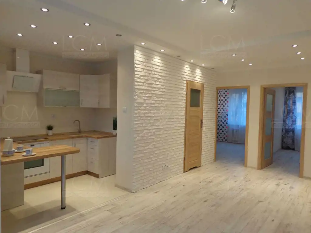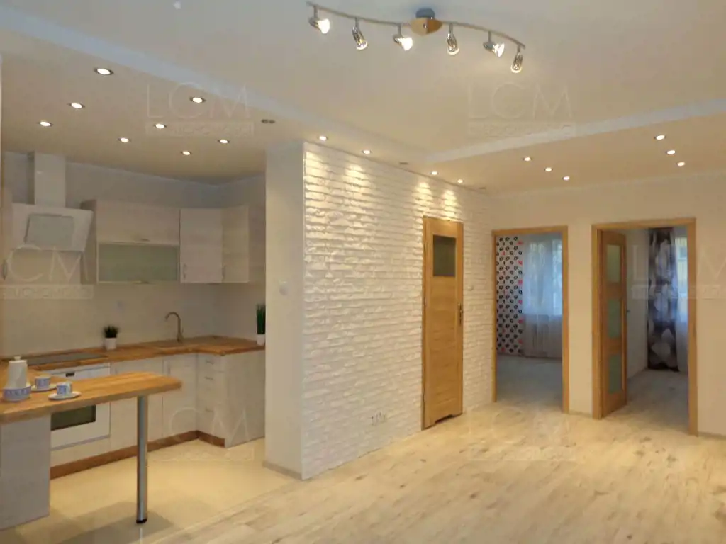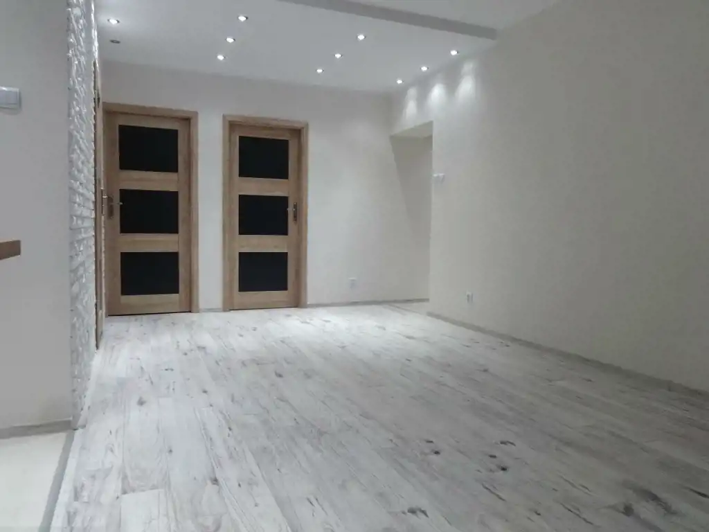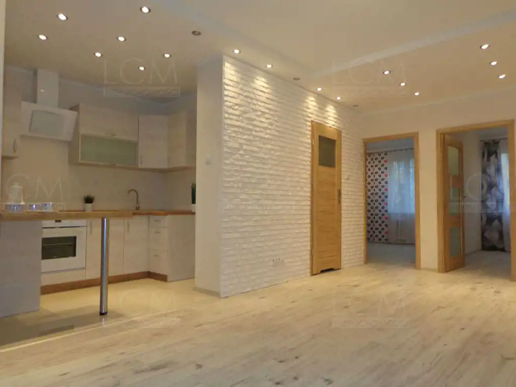 Wymienione zostały wszystkie instalacje. Na podłogach położone zostały panele. Na ścianach gładzie oraz ozdobny kamień. Sufity podwieszane z ledowym oświetleniem. Łazienka z WC w nowoczesnej glazurze i terakocie. Kuchnia także w glazurze i terakocie, z ładną zabudową kuchenną w stonowanych barwach.