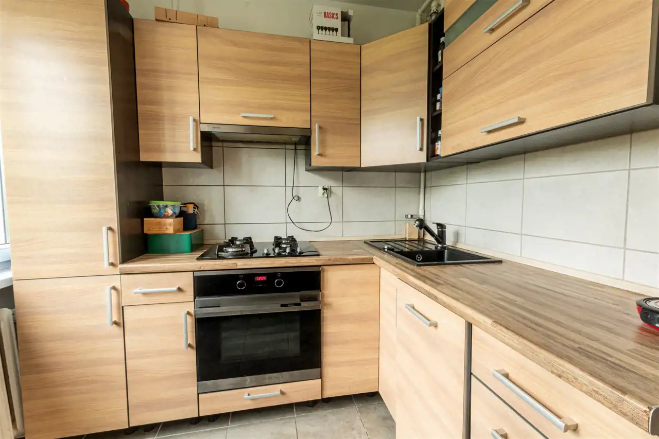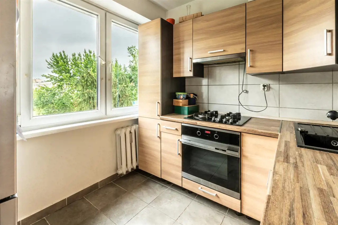 W kuchni, przedpokoju, łazience i wc kafle.