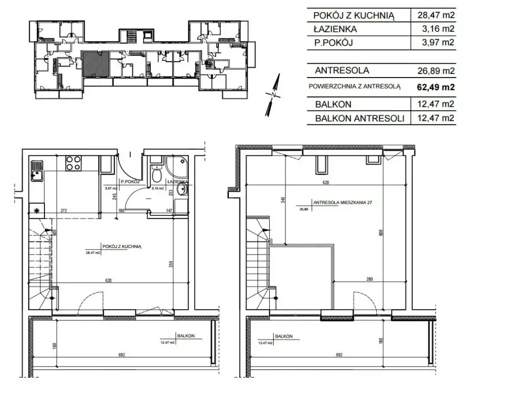Na antresoli o powierzchni 26,89 m2 przewidziano 2 pokoje, miejsce na drugą łazienkę lub garderobę z oknem. Z antresoli prowadzi wyjście na drugi balkon o powierzchni 12,47 m2.