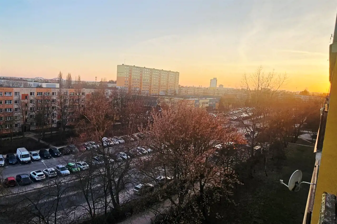 Mieszkanie usytuowane w wieżowcu na 6 piętrze z widokiem na panoramę Rubinkowa, w oddali widać most.