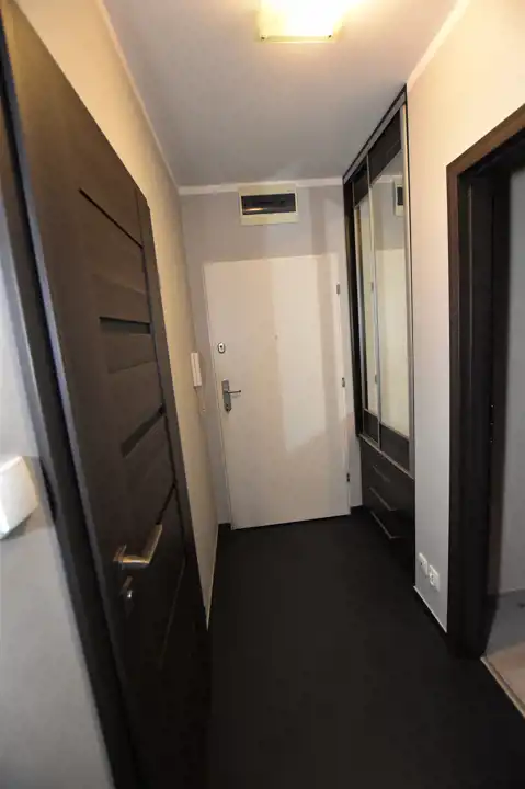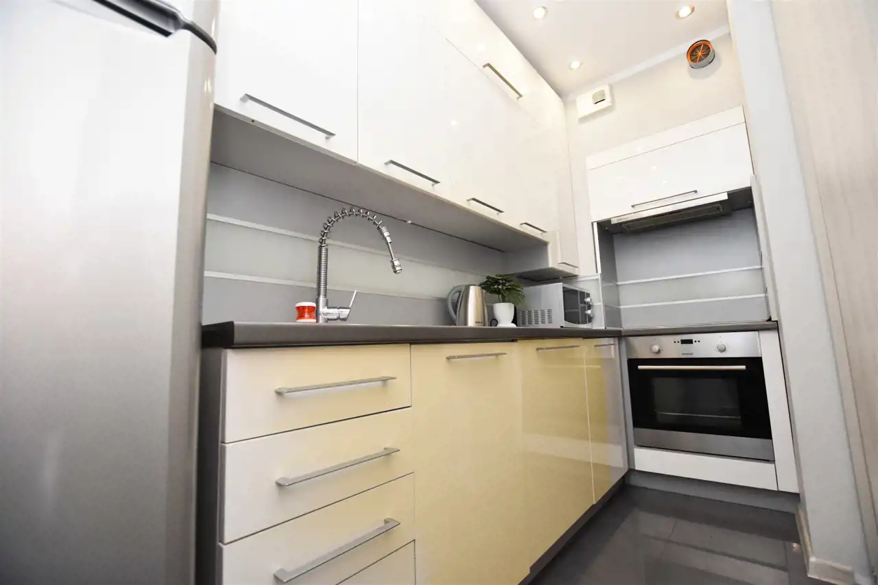 W salonie uroku dodaje klimatyczne oświetlenie ledowe na suficie. W sypialni zabudowana szafa oraz szafki. W aneksie kuchennym zabudowa kuchenna wraz ze sprzętem agd (płyta grzewcza, okap, lodówka, zmywarka). Na podłodze gres.