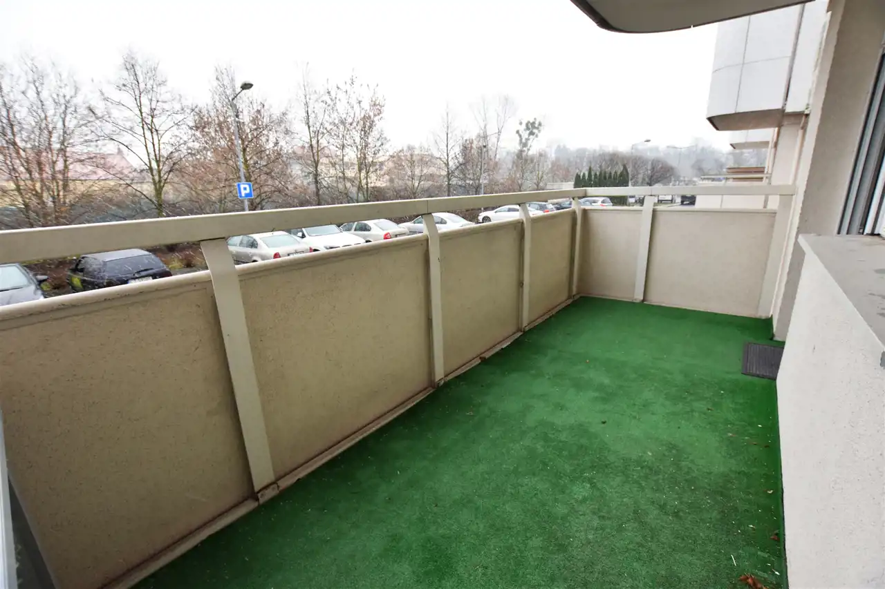Z salonu wyjście na przestronny balkon, z którego rozpościera się widok na parking i tereny zielone. Balkon jest tak duży, że bez problemu ustawisz na nim jakiś zestaw wypoczynkowy (stół z krzesłami) i jeszcze będzie wolna przestrzeń.