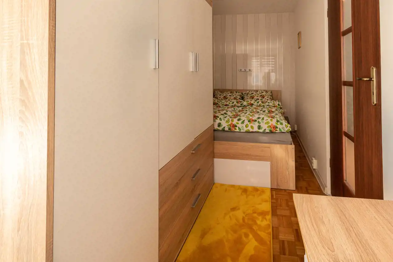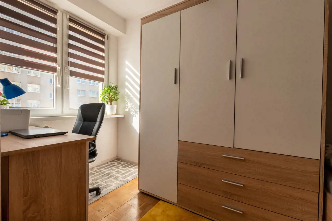 Z salonu przechodzimy do pokoju, w którym w tym momencie mieści się biurko, duża szafa oraz łóżko. Może on pełnić funkcję sypialni, gabinetu czy pokoju dziecięcego.