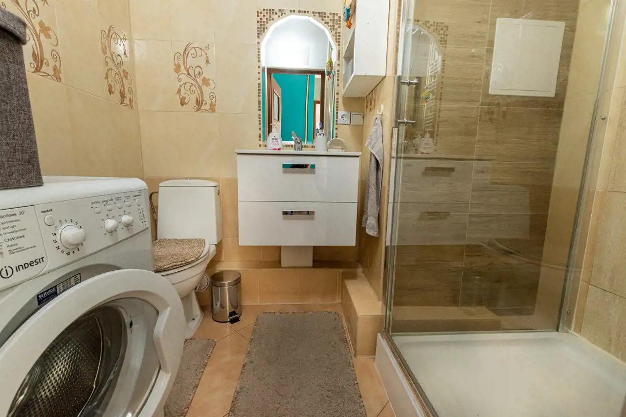 Na lewo od drzwi wejściowych łazienka z wc, wyposażona w prysznic. Glazura nowszego typu, wymienione piony wodno-kanalizacyjne.