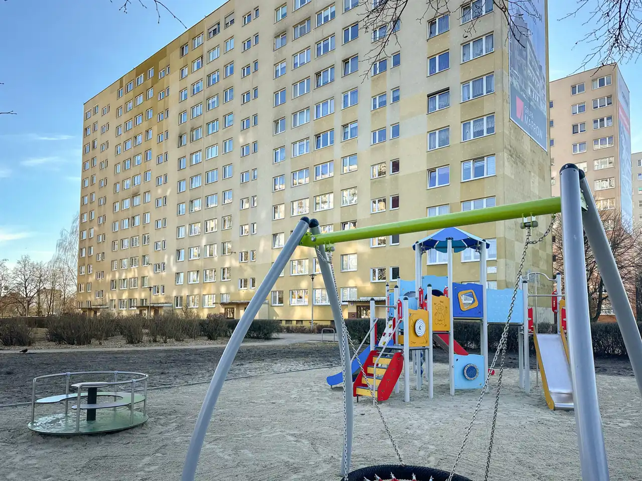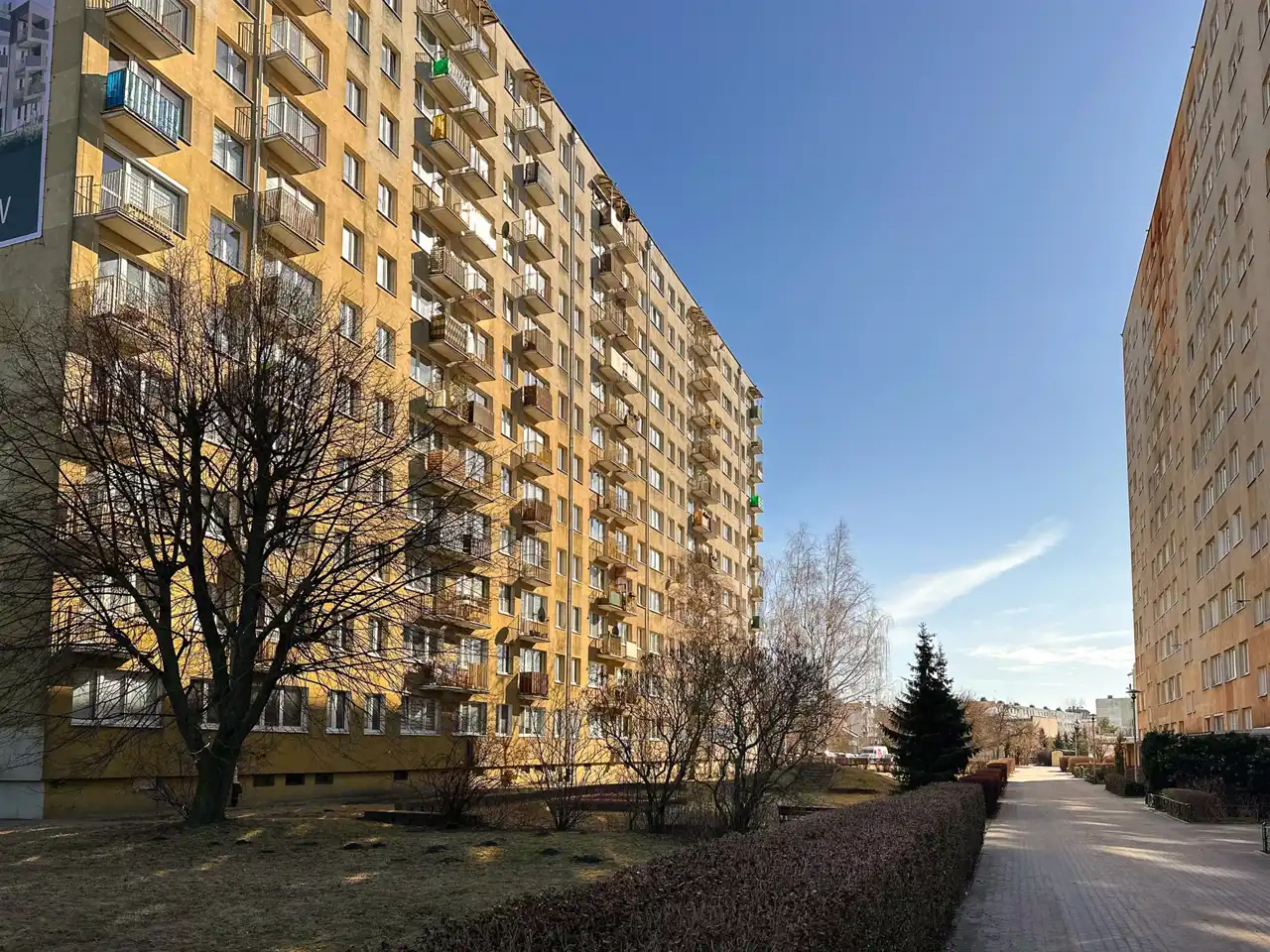 Bardzo ładnie zagospodarowana przestrzeń między budynkami. Dużo zieleni, choć nie widać jej o tej porze roku:).