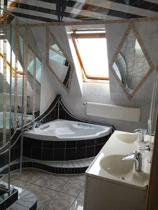 Łazienka wyposażona w wannę z hydromasażem i kabinę prysznicową.