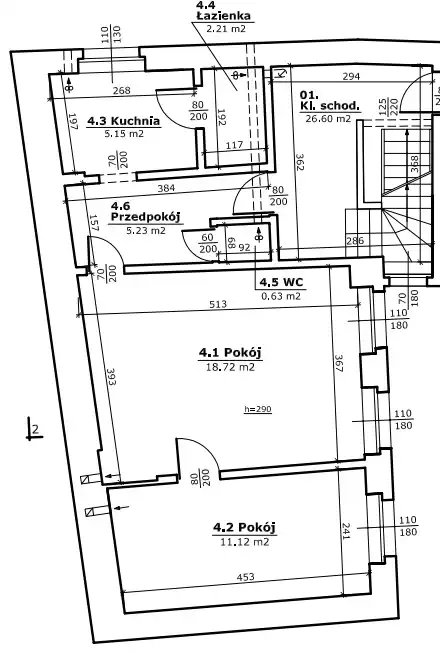 Mieszkanie o pw. 43,06 m2 znajduje się na pierwszym piętrze.