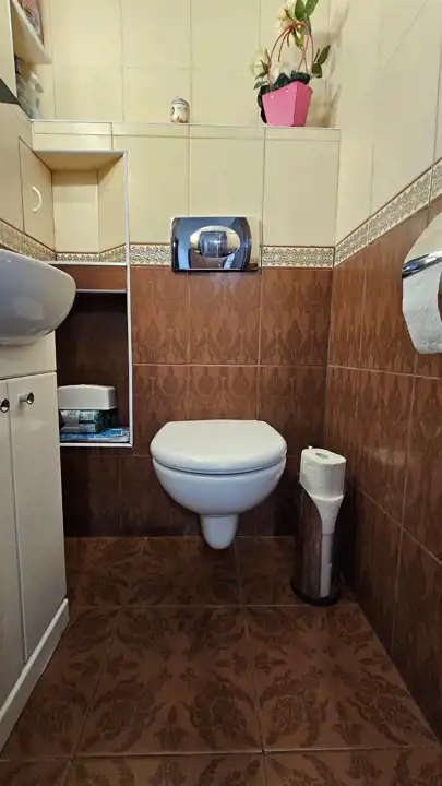 W łazience wanna i pralka, osobna toaleta z dodatkową umywalką