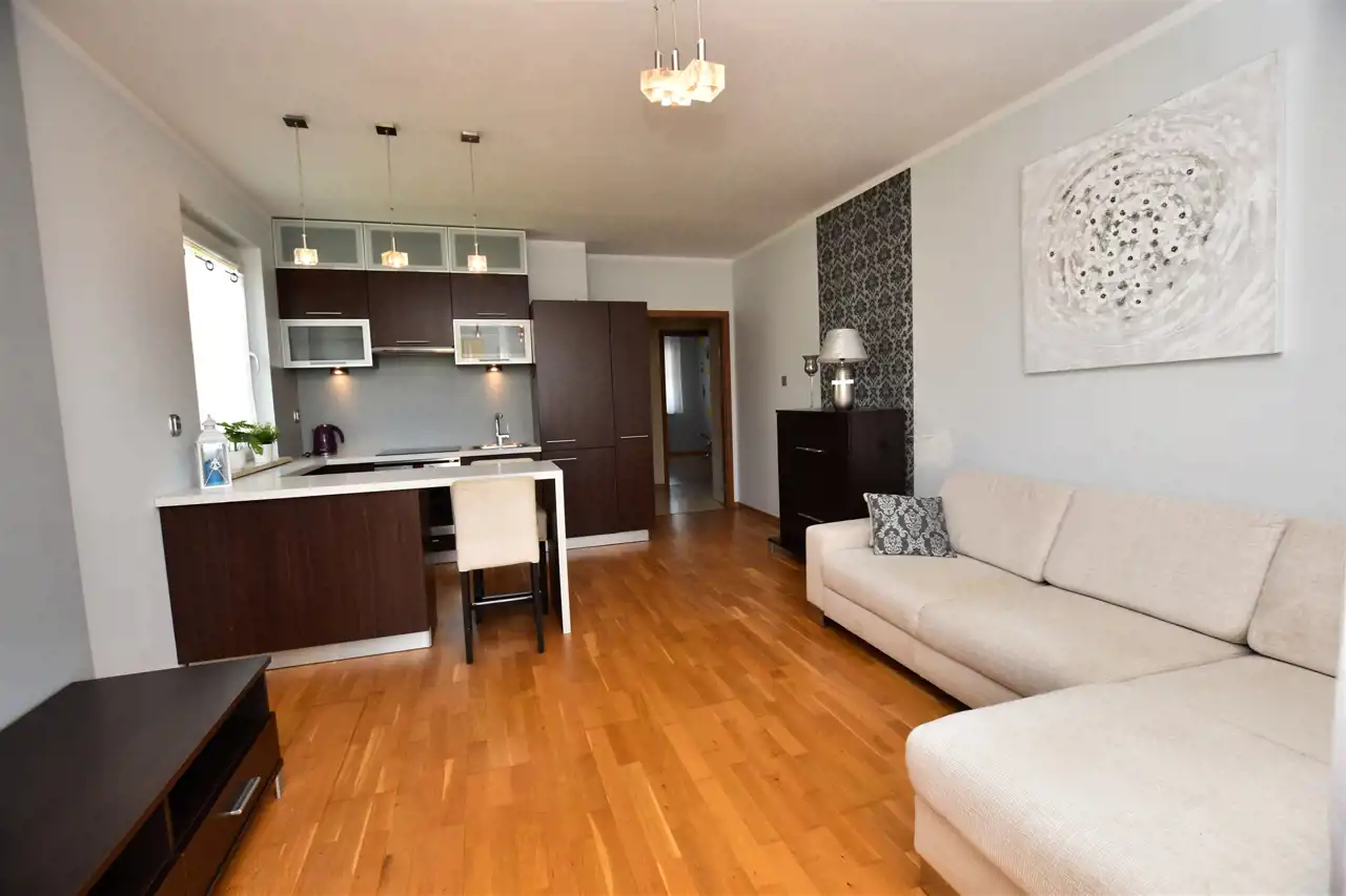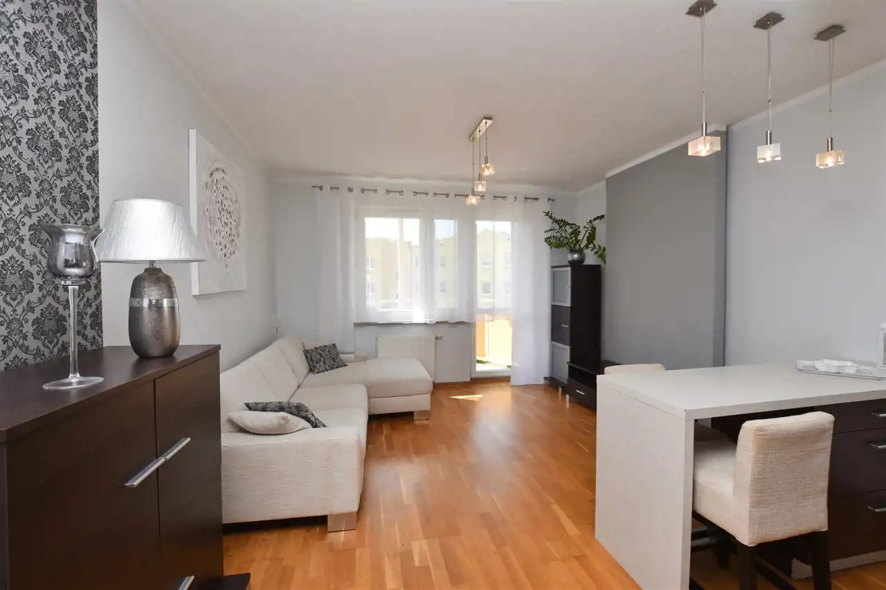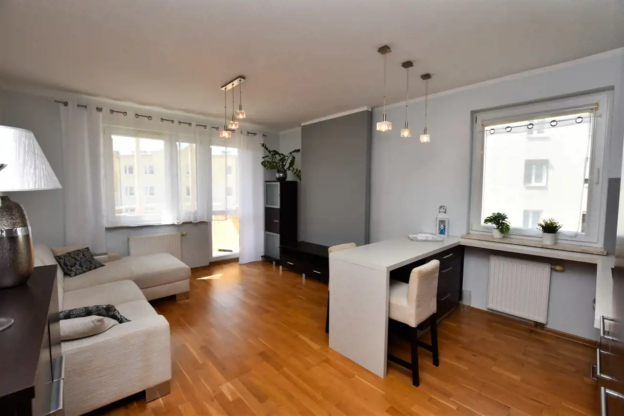 Wartością dodaną tej nieruchomości jest możliwość pozostawienia umeblowania oraz wyposażenia tego lokalu z wyjątkiem narożnika w salonie oraz lamp nocnych w sypialni. Między innymi do dyspozycji przyszłego lokatora tego mieszkania mogą pozostać - komoda, szafka rtv oraz witryna w salonie, zabudowa kuchenna wraz ze sprzętem agd (zmywarka, lodówko-zamrażarka w zabudowie, płyta grzewcza) i dużym blatem roboczym (wyspa).
