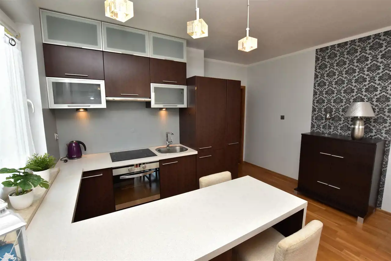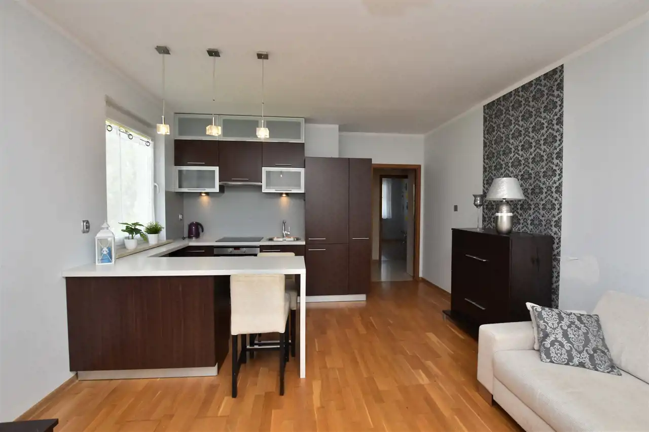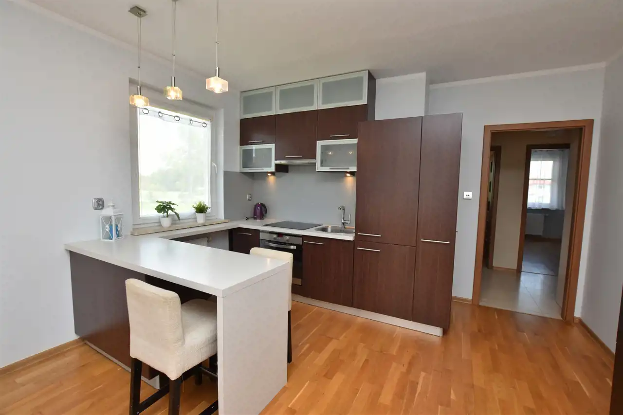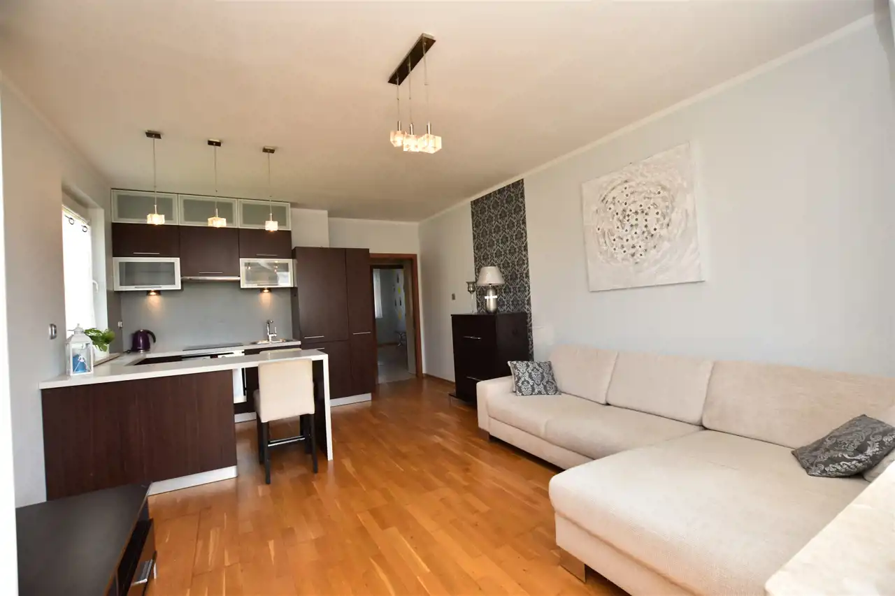 Wartością dodaną tej nieruchomości jest możliwość pozostawienia umeblowania oraz wyposażenia tego lokalu z wyjątkiem narożnika w salonie oraz lamp nocnych w sypialni. Między innymi do dyspozycji przyszłego lokatora tego mieszkania mogą pozostać - komoda, szafka rtv oraz witryna w salonie, zabudowa kuchenna wraz ze sprzętem agd (zmywarka, lodówko-zamrażarka w zabudowie, płyta grzewcza) i dużym blatem roboczym (wyspa).
