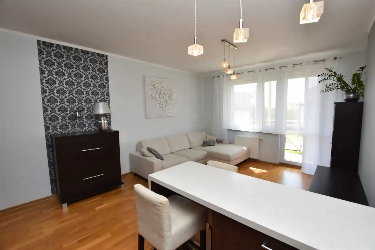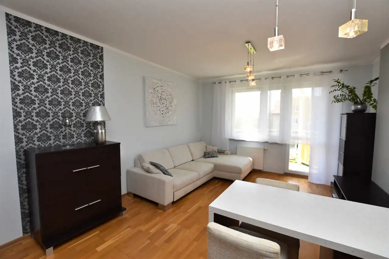 Mieszkanie na kameralnym i nowoczesnym osiedlu z monitoringiem, pierwsze piętro w niskim bloku, możliwość pozostawienia umeblowania i wyposażenia lokalu (z wyjątkiem narożnika i dwóch lamp nocnych), brak problemów z parkowaniem auta, przestronność i funkcjonalność pomieszczeń to główne atuty tej nieruchomości.