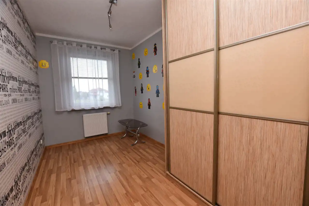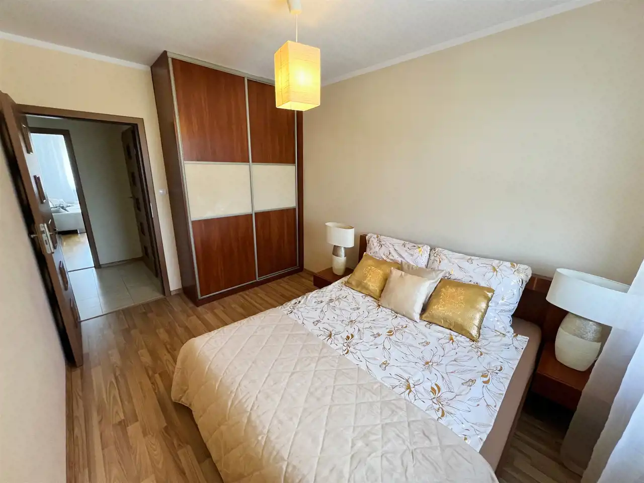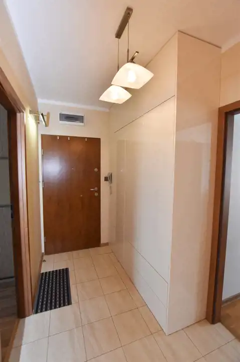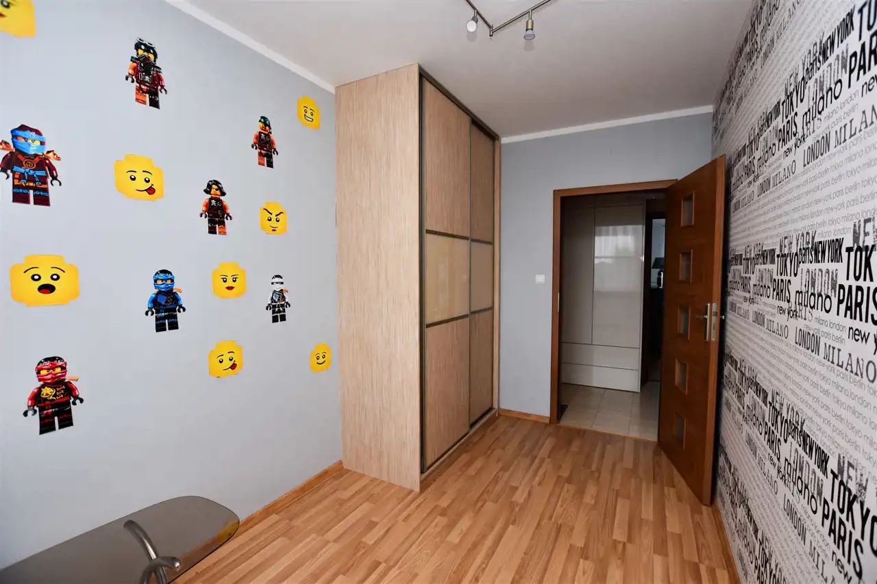 W średnim pokoju pozostaje łóżko małżeńskie z materacem, zabudowana szafa, w najmniejszym pokoju zabudowana szafa. W przedpokoju funkcjonalna szafa z klimatycznym oświetleniem w środku. W łazience glazura i terakota, do dyspozycji kabina prysznicowa oraz pralka. Oświetlenie w całym mieszkaniu.