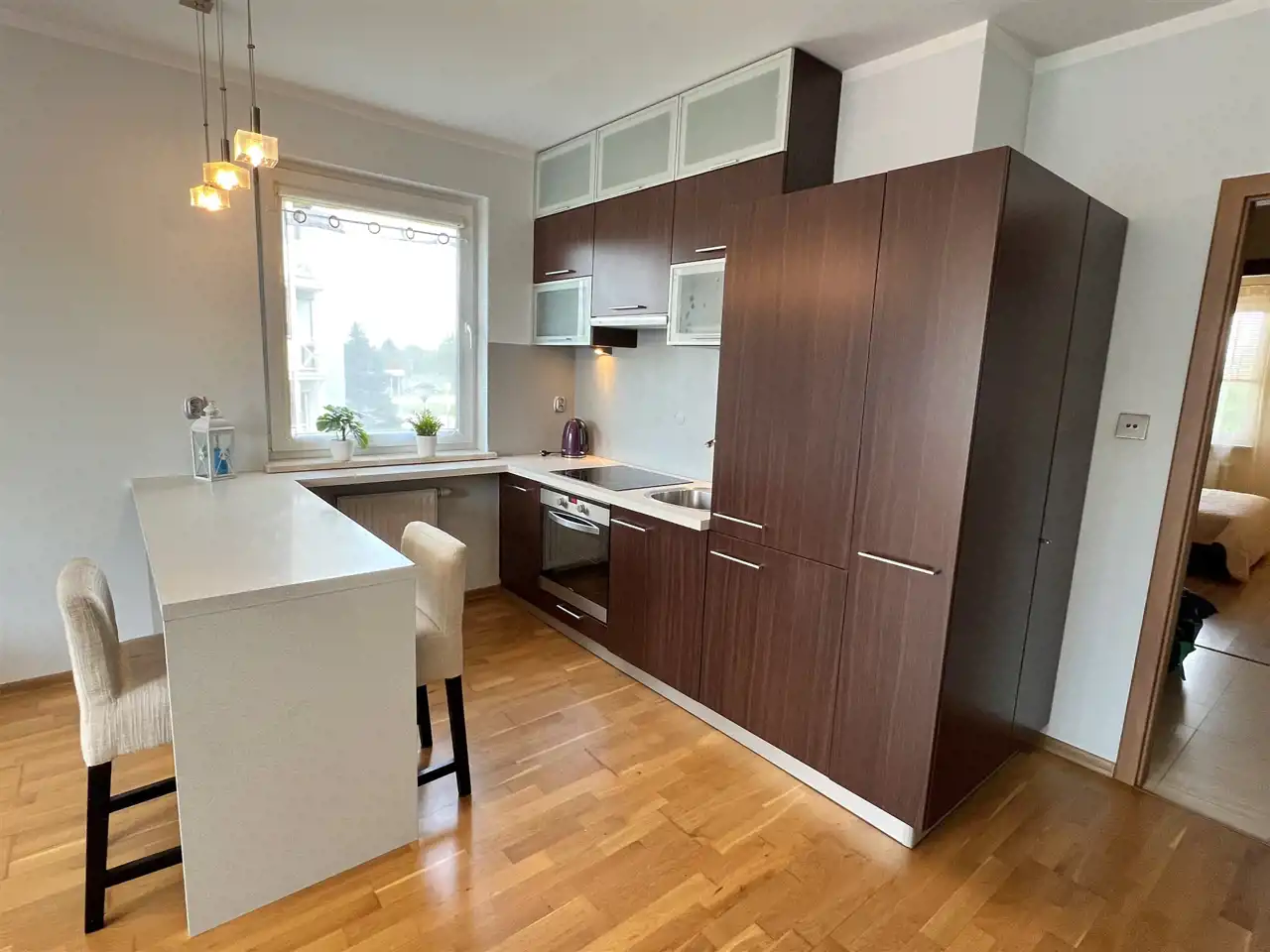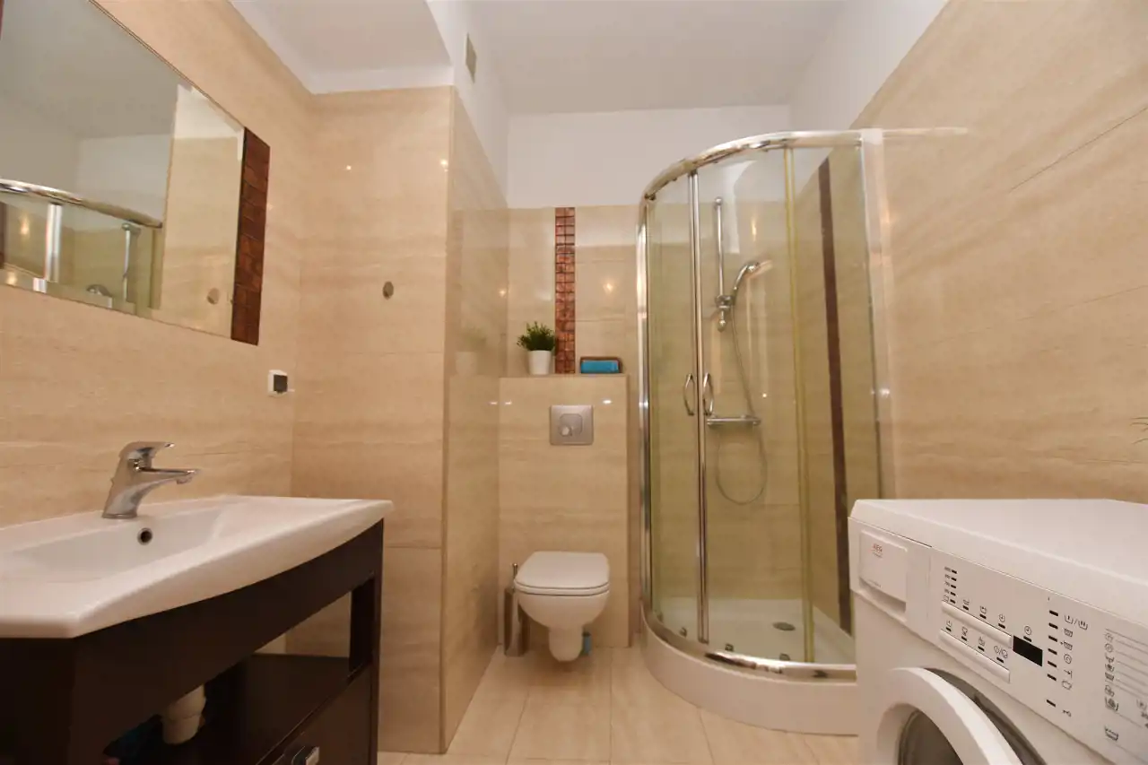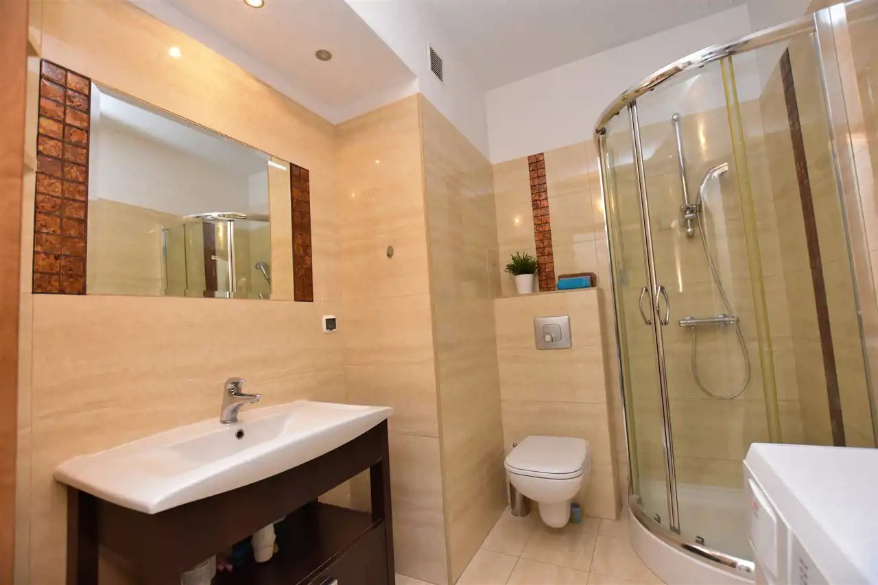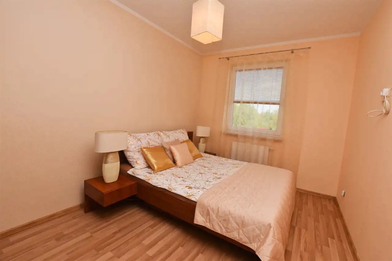 W średnim pokoju pozostaje łóżko małżeńskie z materacem, zabudowana szafa, w najmniejszym pokoju zabudowana szafa. W przedpokoju funkcjonalna szafa z klimatycznym oświetleniem w środku. W łazience glazura i terakota, do dyspozycji kabina prysznicowa oraz pralka. Oświetlenie w całym mieszkaniu.