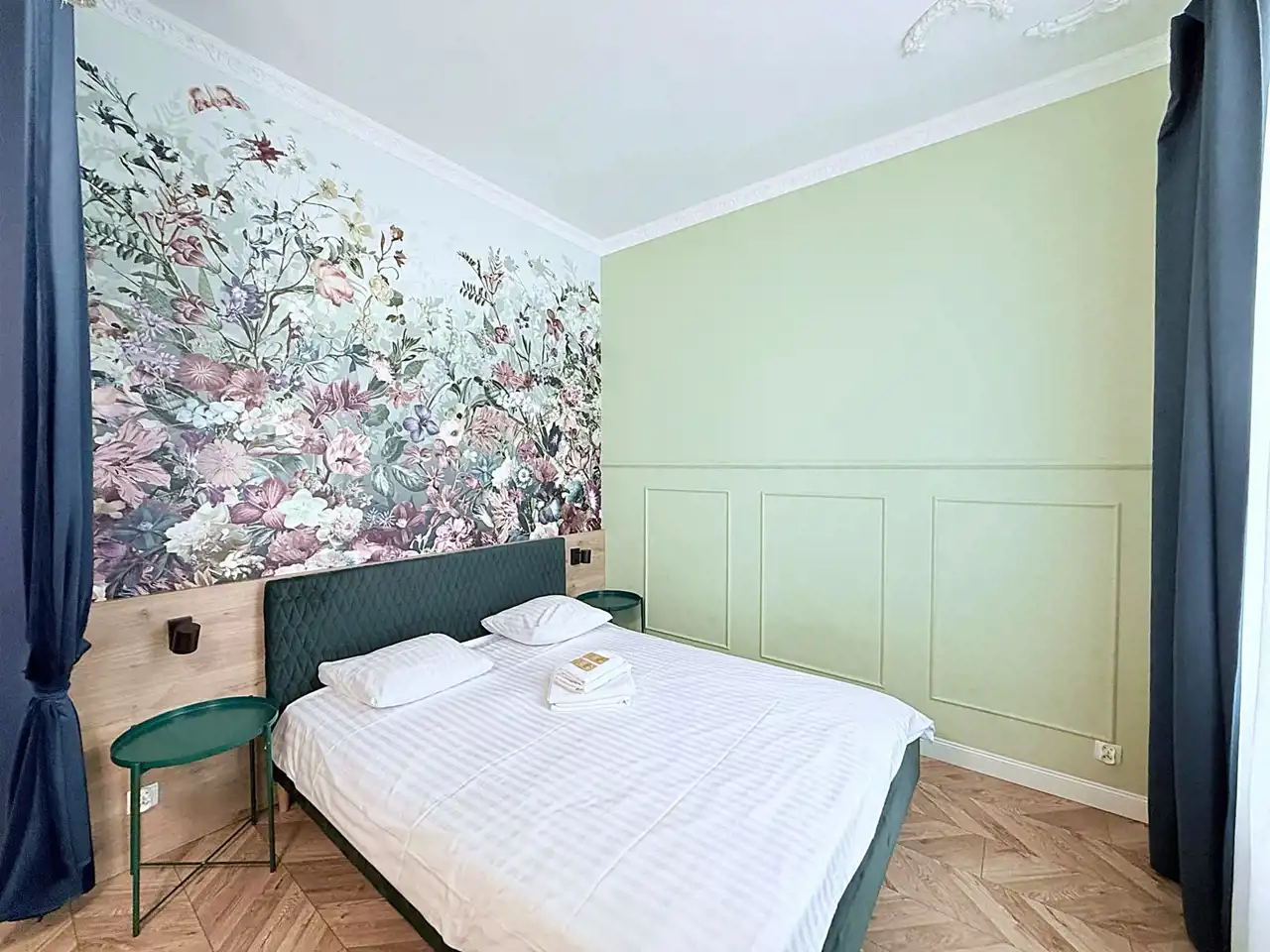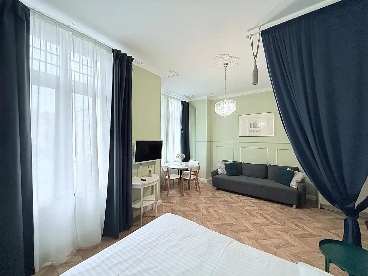 W apartamencie inspirowanym stylem historycznym znajdują się sztukaterie, zdobione listwy sufitowe, dekoracyjne zasłony przy łóżku, oryginalny, stylowy wykusz.