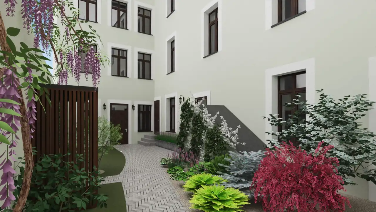 Do oferty zostały dołączone rzut mieszkania wizualizacja dziedzińca i elewacji kamienicy oraz film.